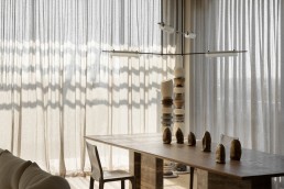 The penthouse features our Terra Plinth in the hallway, Onda Side Table in Titanium Travertine, Bespoke Dolce Bedsides in all bedrooms, and a grande Custom Dining Table.